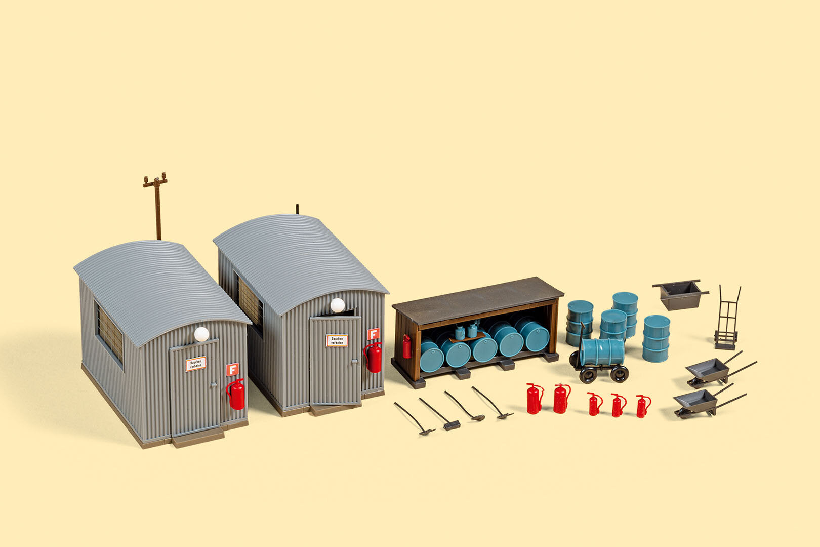 Fässer, Fasswagen, Feuerlöscher sowie Werkzeuge liegen bei.