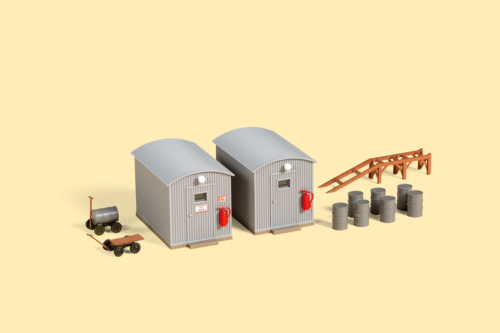 Die Hütten lassen sich vielseitig einsetzen - einzeln oder als Ensemble. Eine Rampe aus stabilem Karton in Lasercut-Technologie liegt bei und erleichtert das Be- und Entladen.