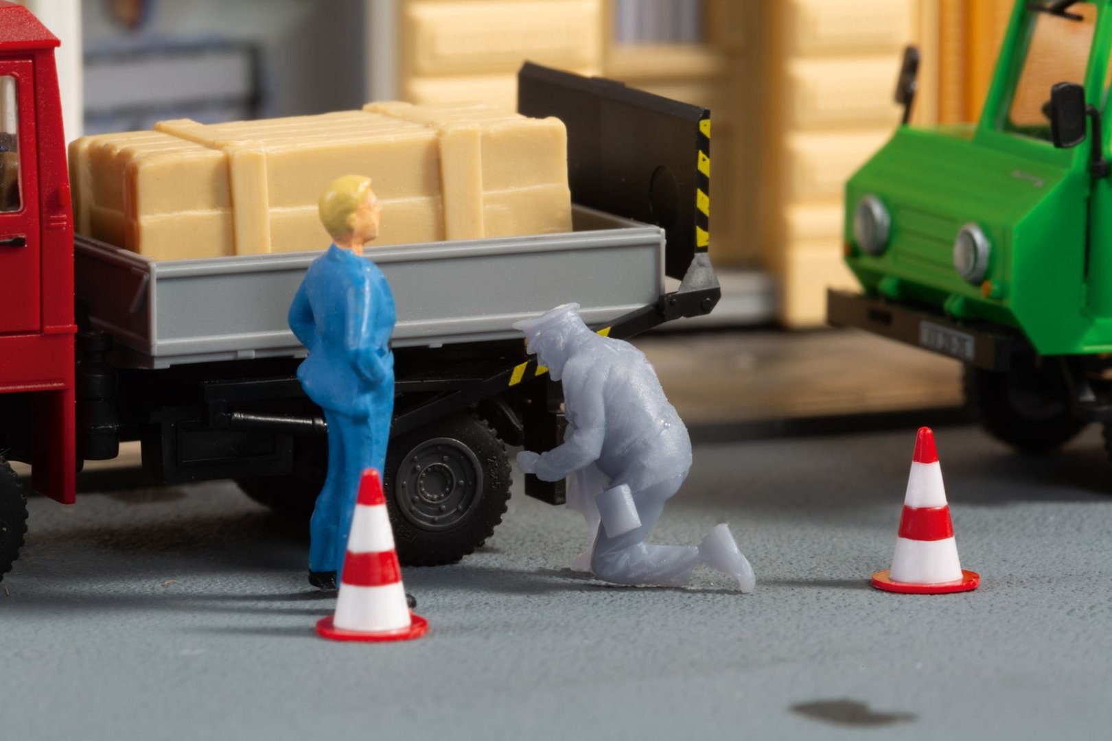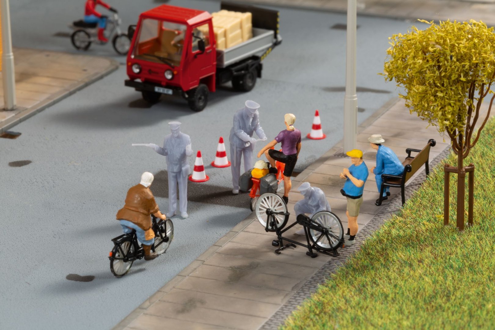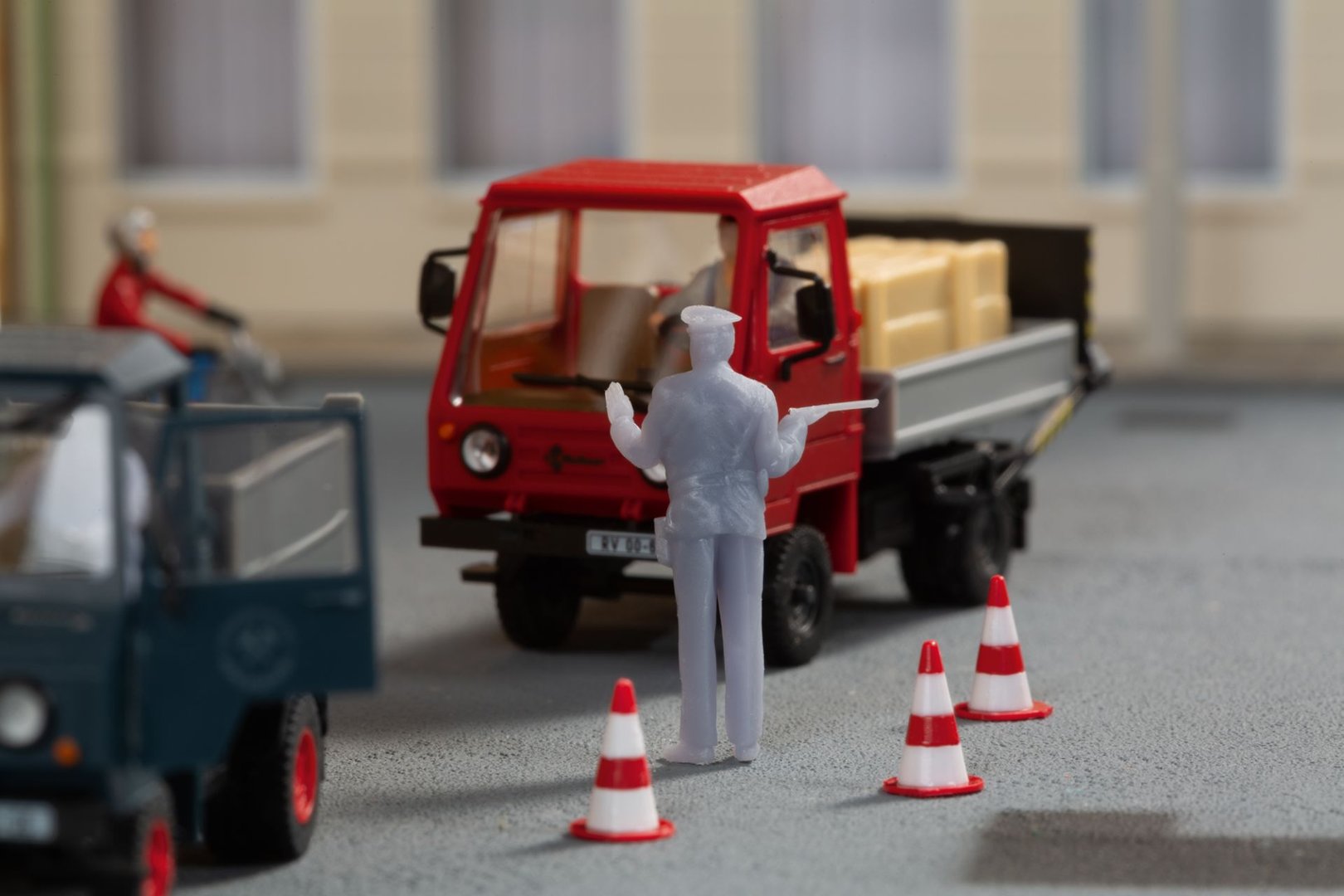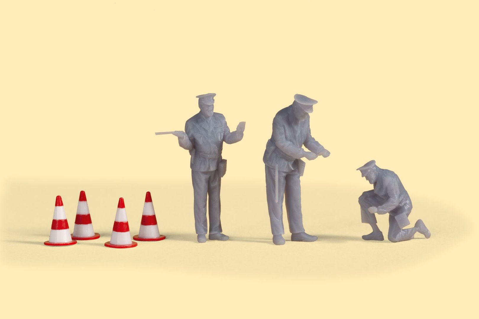 Drei Figuren in Uniform eines Verkehrspolizisten, die leicht selbst bemalt werden können, in realistischen Posen und 4 Verkehrsleitkegel zur authentischen Darstellung von Verkehrskontrollen.