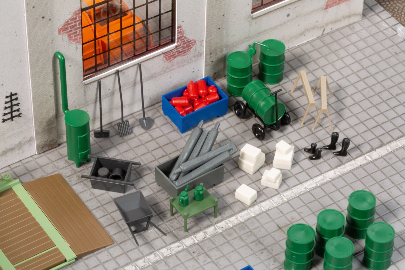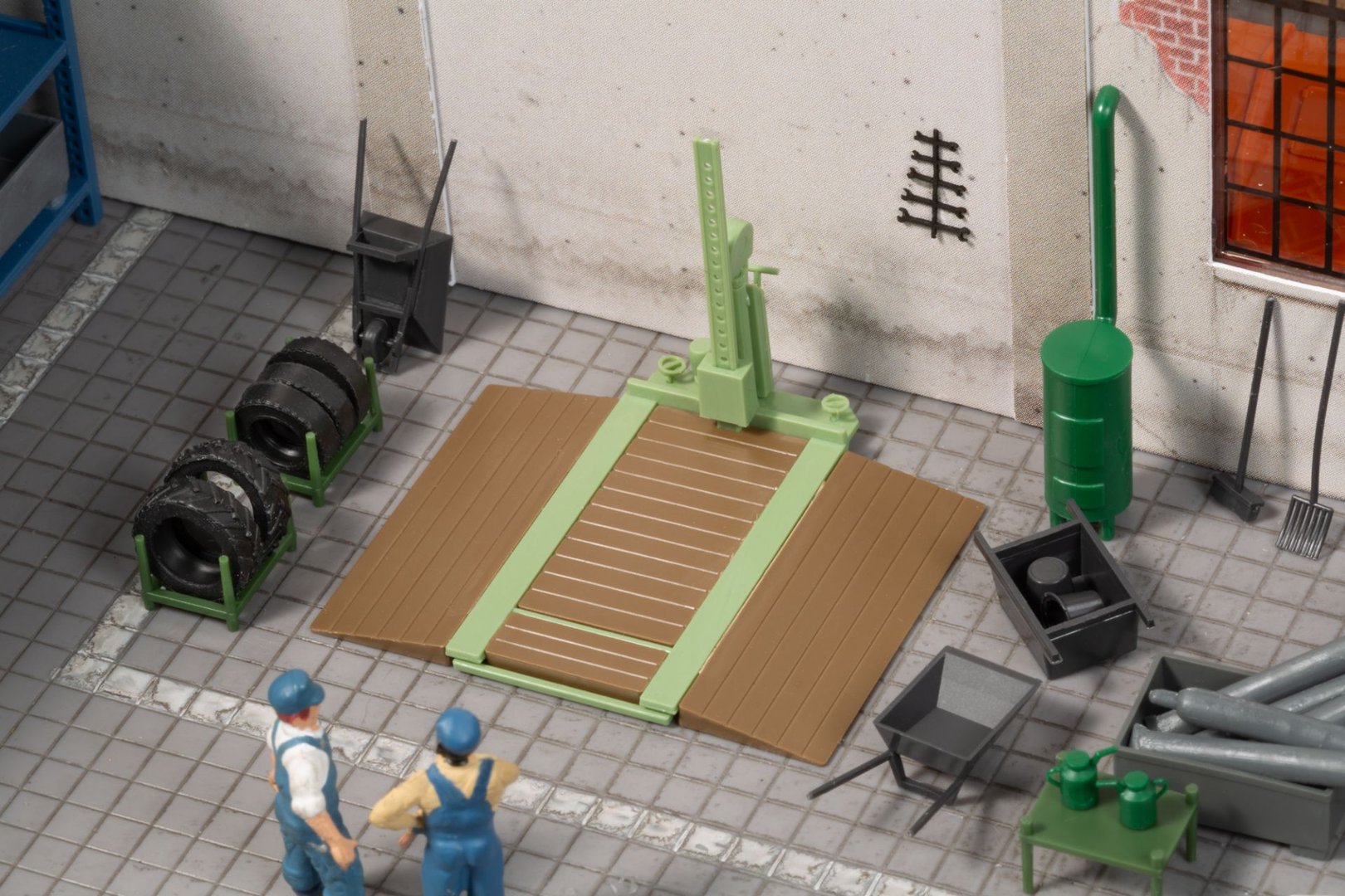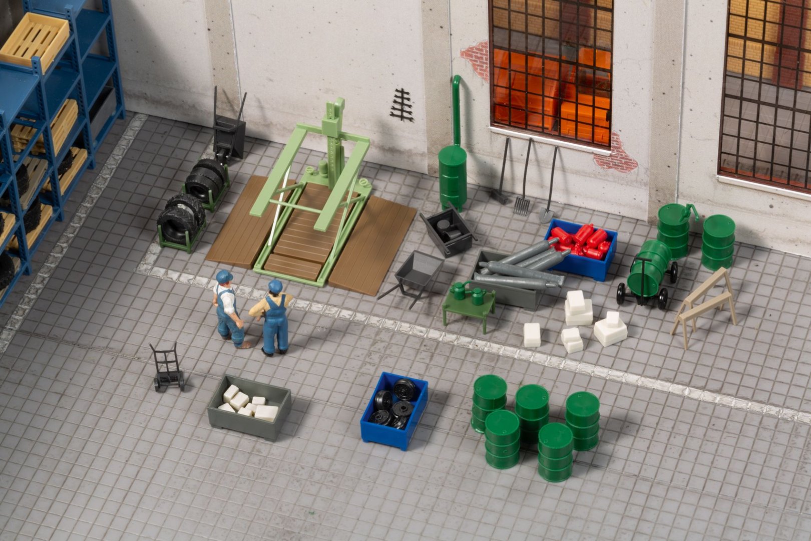 Umfangreiche Ausstattung für Kfz-Werkstätten: eine Scherenhebebühne, ein Ofen, mehrere Fässer, ein Fasswagen, 4 Transportkisten, mehrere Reifen nebst Felgen, Flaschen, Gläser, Gasflaschen, Kisten, Böcke und Werkzeug, auch in Lasercut, lassen keine Wünsche mehr für einen Modellmechaniker offen!