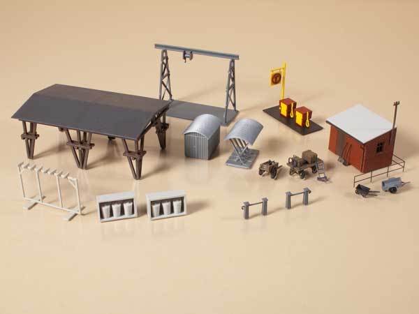 Neben vielen Kleinteilen, wie Badewanne und Gießkannen, Pergola, Blumenspalier, Holztore, PKW-Anhänger, Tafelwagen mit Holzkisten, Schubkarre, Müllkübeln und Briefkästen können Sie mit dem umfangreichen Inhalt auch einen Schauer, einen Wellblechschuppen, einen Bockkran und Tanksäulen gestalten.