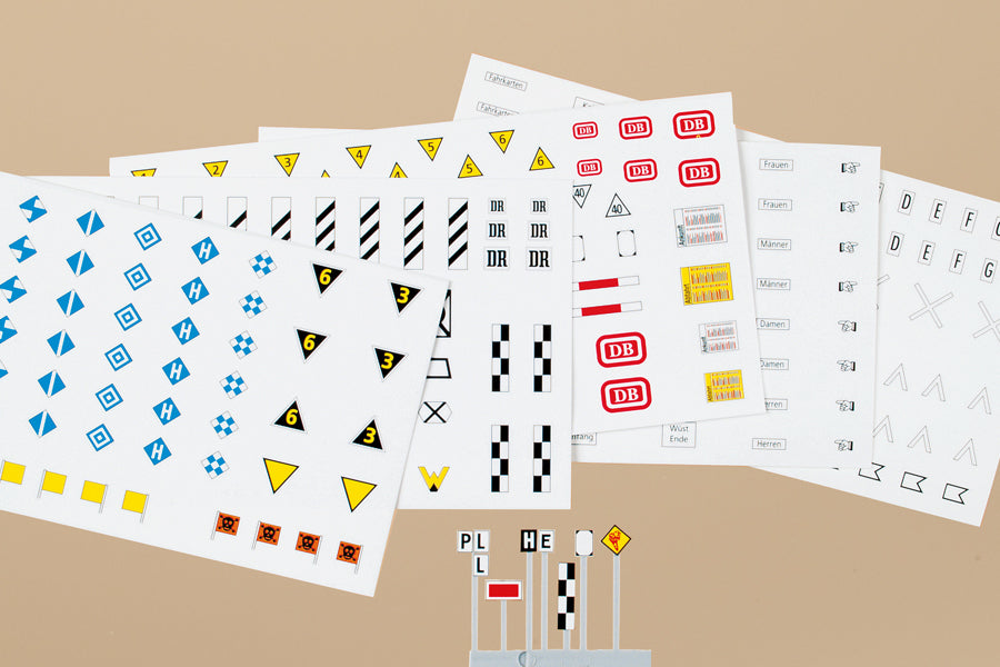 Über 380 Signaltafeln und Eisenbahnschilder der Deutschen Reichsbahn sowie Logos der Deutschen Bundesbahn sind auf hochwertigem Karton gedruckt. Außerdem liegen 90 Säulen bei.