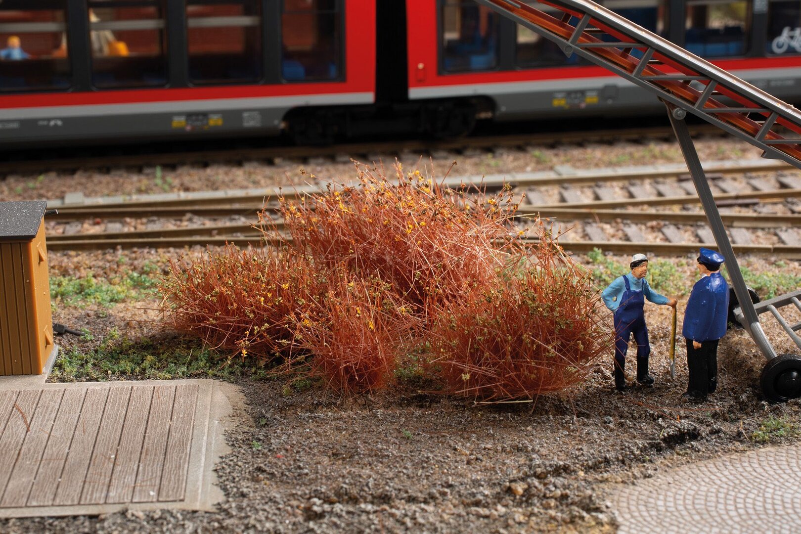 Das Material eignet sich sehr gut zur Gestaltung von Stauden, Sträuchern und Büschen. Einfach mit einer Pinzette auseinander zupfen und mit Auhagen-Weißleim Art. 53521 auf die Anlage aufbringen.