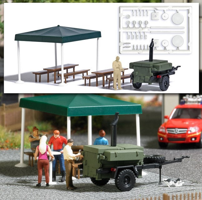 Bausatz für einen Einachsanhänger Typ HL 10.00 mit dem Aufbau einer so genannten »Gulaschkanone«. Auch als Feldküche einsetzbar. Mit Figur (unbemalt), Pavillon, Sitzgarnituren, Stehtischen und Geschirr.