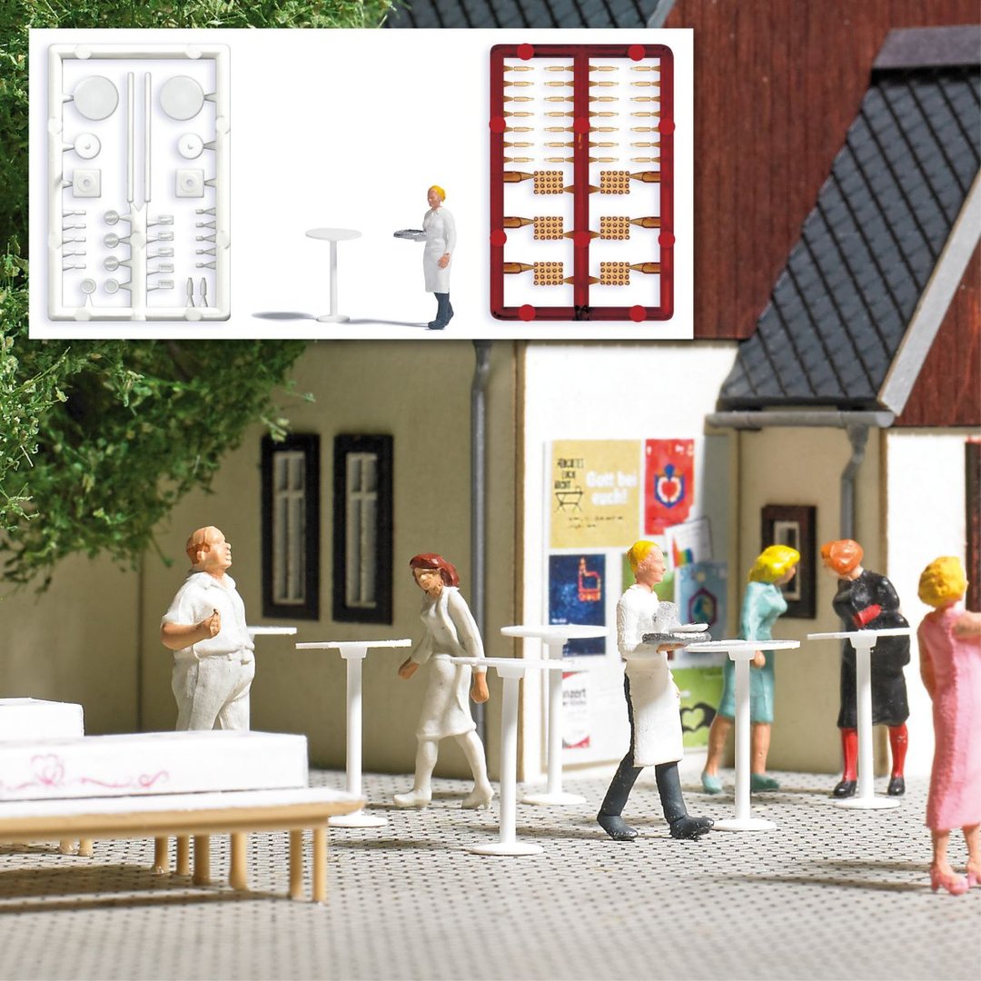 - Kellnerin (fertig bemalt) mit 6 Stehtischen sowie Geschirr und Getränkeflaschen. Bausatz.