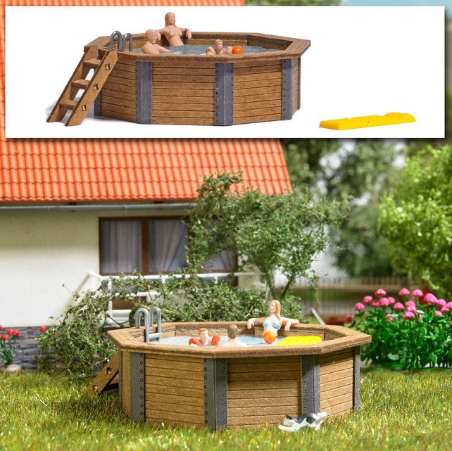 Bausatz für einen Swimming-Pool mit Holzeinfassung aus echtem Holz. Mit Einstieg, Leiter, realistischer Wasseroberfläche sowie Wasserball und Luftmatraze. Inklusive 3 »schwimmenden« Figuren (unbemalt).