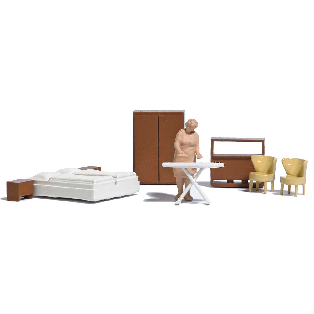 Dieses universell einsetzbare Einrichtungsset belebt jede Wohnung oder Haus mit Möbeln, Figur und thematisch passendem Zubehör. In der Szene bügelt eine Frau im Schlafzimmer. Mit Ausschneidebogen für Bodenbeläge und Wanddekoration, 7-teiligem Schlafzimmermöbel, Bügelbrett sowie Figur zum selbst Bemalen. Bausatz.Ideale Ergänzung für WBS 70 Plattenbau-Wohnungen von Busch Nr. 1990.