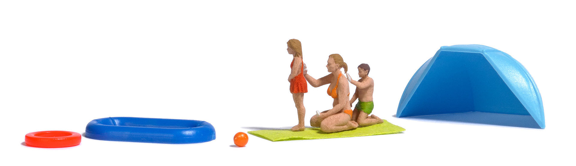 Mit Mutter, 2 Kindern, Liegetuch, Ball, Schwimmring, kleinem Gummiboot und Strandmuschel.