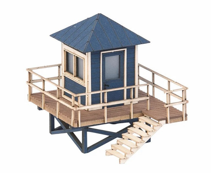 Die Stelzenhütte der Rettungsschwimmer ist in einem typischen maritimen blau gestrichen und hat weiße Fensterläden.