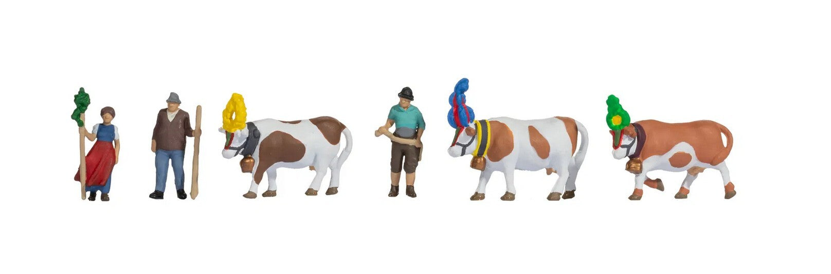 Das Figuren-Set Almabtrieb von NOCH bringt den Charme eines traditionellen bayerischen Almabtriebs auf Ihre Modellbahnanlage. Das Set umfasst detailgetreu gestaltete Figuren: stolze Bauern und Bäuerinnen in traditioneller Tracht sowie liebevoll dekorierte Kühe mit Blumen und Glocken. Perfekt für die Gestaltung von Szenen auf Alpenweiden, in Dörfern oder bei Festumzügen.