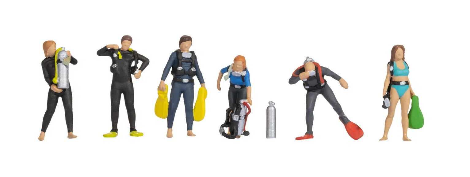 Mit dem Figuren-Set Taucher von NOCH holen Sie das Abenteuer des Tauchens in Ihre Modelllandschaft. Die sechs detailreich gestalteten Figuren zeigen Taucher in voller Ausrüstung, bereit für ihre Erkundungstouren. Ob in Neoprenanzügen, mit Sauerstoffflaschen oder Tauchflossen – jede Figur besticht durch präzise Details und lebendige Posen.