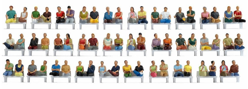 Viele Modellwaggon-Inneneinrichtungen sind technisch bedingt mit niedrigen Sitzen ausgestattet. Oft muss man den Figuren daher die Beine entfernen bevor man sie auf die Sitze kleben kann. Noch bequemer geht es mit der neuen Großpackung, die gleich 60 handbemalte sitzende Figuren ohne Beine enthält.
