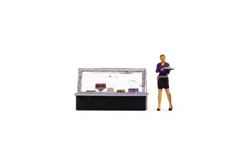 Mit den Tiny-Scenes können Sie einen realistischen Markt auf Ihrer Modelllandschaft ausgestalten. In dieser Szene ist ein schwarz-silberner Kuchenstand enthalten. Die fünf verschiedenen Kuchen sind liebevoll auf der Verkaufsfläche platziert. Zudem ist eine weibliche Modelfigur enthalten. Diese trägt einen schwarzen Rock sowie eine lilafarbene Bluse und hält ein Tablett mit einem Kuchenstück in den Händen.