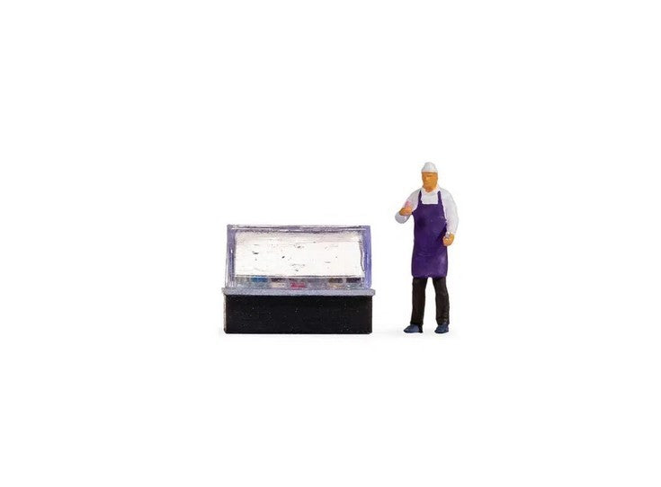 In dieser Szene ist eine schwarz-silbernere Eisdiele enthalten. Dazu passend steht ein männlicher Eisverkäufer hinter der Theke und verkauft das Eis. Er trägt eine typische dunkelblaue Schürze und eine weiße Kopfbedeckung.