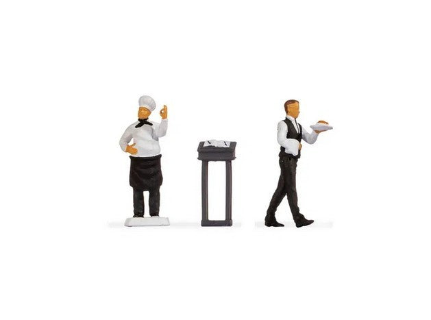 In dieser Szene ist ein schwarz-weiß gekleideter dickbäuchiger Koch mit einer Kochmütze, ein Kellner, ebenfalls in schickem, schwarz-weiß und eine kleine Theke enthalten.