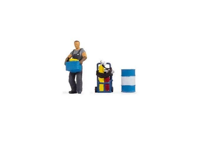 Er trägt gerade eine Kiste mit Artikeln, die er vermutlich gleich einräumen will. Ebenfalls im Set enthalten ist eine blau-weiß gestreifte Tonne und eine beladene Sackkarre.