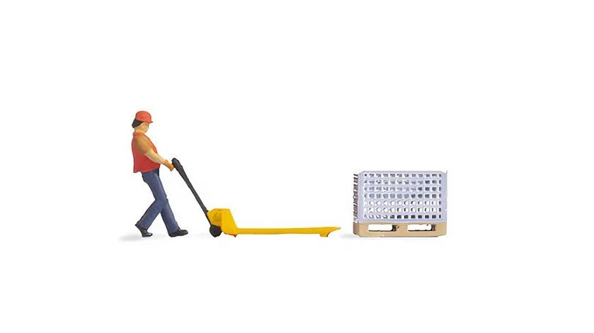 In dieser Szene fährt ein männlicher Lagerarbeiter mit einem Hubwagen. Er trägt eine orange Weste, eine orange Mütze und dunkelblaue Arbeitshosen. Zusätzlich ist noch eine passende Europalette mit Metallgitter Box im Set enthalten.