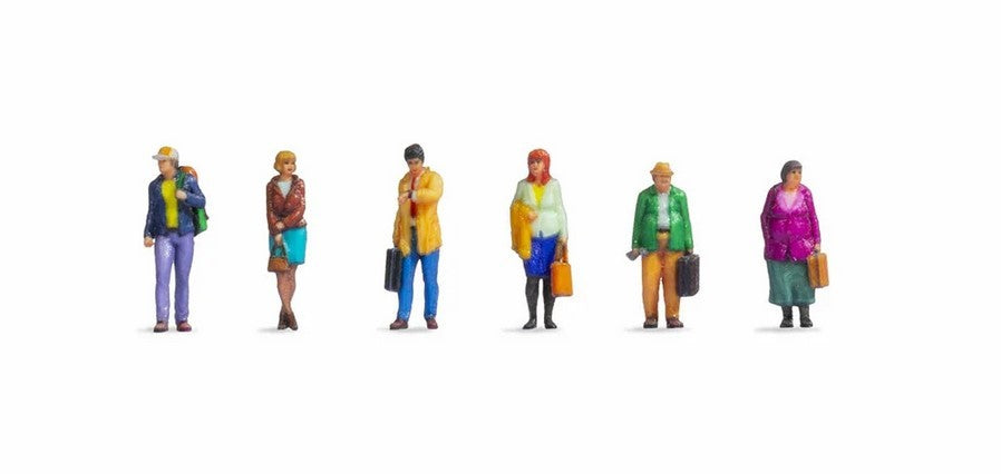 Reisen ohne Gepäck? Das gibt es selten! Auch unsere Modellfiguren reisen mit Koffer und Rucksack. Vier Figuren tragen einen Koffer, eine einen Rucksack und eine weitere Dame trägt eine kleine Handtasche.