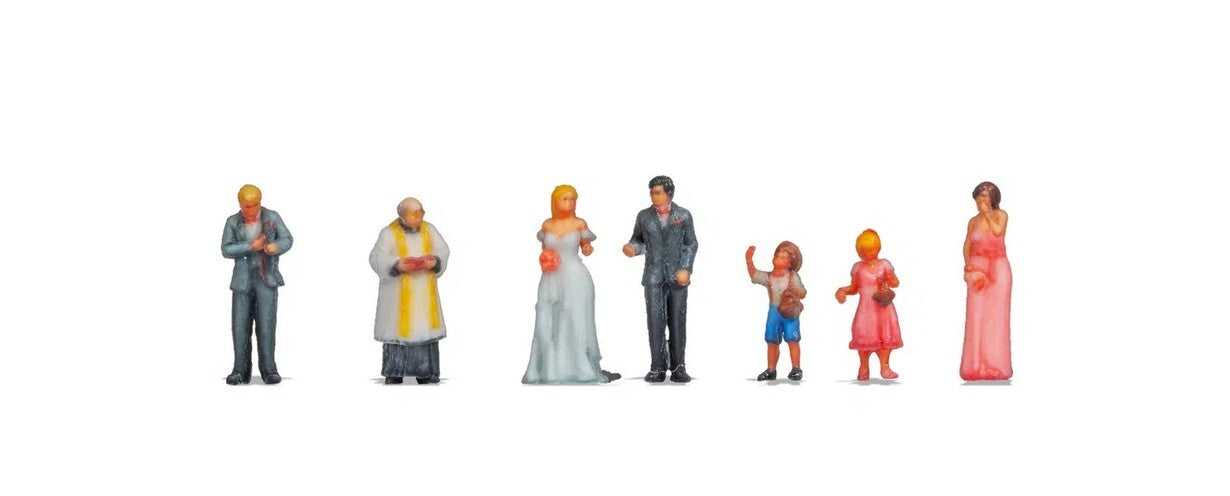 Eines der schönsten Themen, die man im Modell nachstellen kann: eine Hochzeit. Festlich in einen hellen Anzug gekleidet erscheint der blonde Trauzeuge des Bräutigams neben dem Pfarrer. Dieser hat bereits ein Auge auf das Brautpaar geworfen, das zu ihm an den Altar tritt und freut sich schon auf die Feier, auf die er ebenfalls eingeladen ist. Die wunderschöne, blonde Braut trägt ein klassisches, langes, weißes Hochzeitskleid und reicht ihrem zukünftigen Ehemann die Hand. Dieser ist im hochgeschlossenen, schwarzen Anzug erschienen. Ganz besonders großen Spaß haben die beiden Blumenkinder, die ihre Blumen verstreuen. Da kann auch die Brautjungfer in zartrosa Kleid nicht mehr an sich halten und vergießt ein paar Tränchen der Rührung. Heimlich hat sie auch schon einen Blick auf den Trauzeugen geworfen und mit etwas Glück fängt sie nachher vielleicht sogar den Brautstrauß.