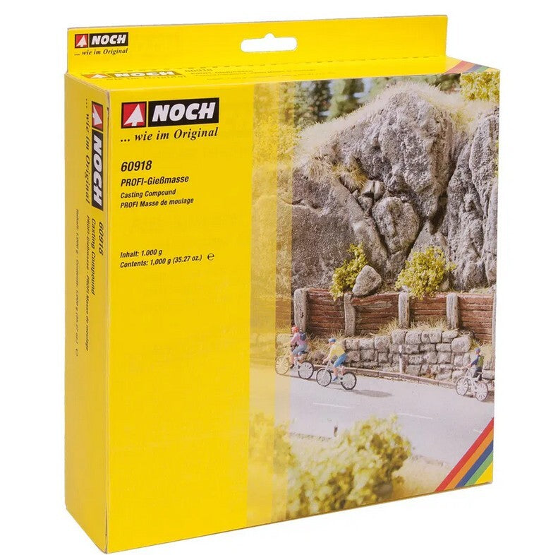 Die spezielle NOCH "PROFI-Gießmasse" lässt sich ganz einfach im Verhältnis 1:3 mit Wasser anrühren, blasenfrei in Fels-Gussformen füllen und bietet ein hohes Maß an Stabilität. Sie härtet weiß aus und ist damit das ideale Basismaterial für selbstgegossene Felsen, das anschließend mit NOCH Naturfarben koloriert wird.