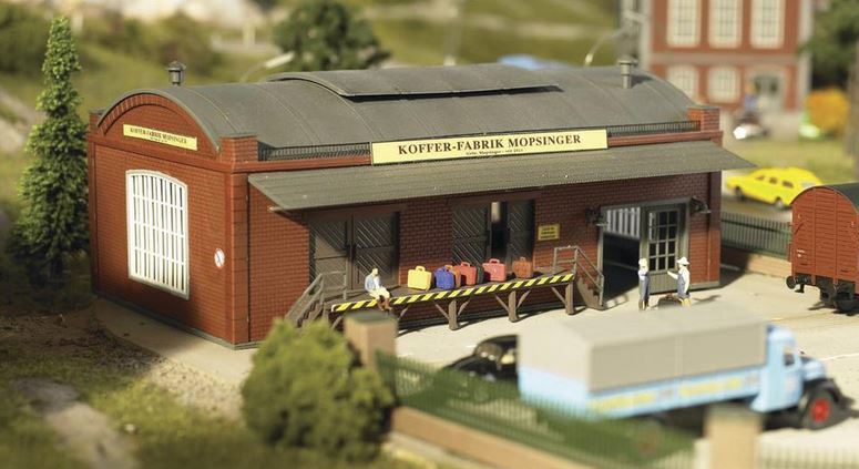 Auf der Rampe dieses kompakten Betriebsgebäudes stehen schon die verschiedensten Koffermodelle abholbereit für die Kunden. Die Türen des Gebäudes sind beweglich. Dekoartikel (Autos, Figuren etc.) sind kein Bestandteil des Lieferumfangs.