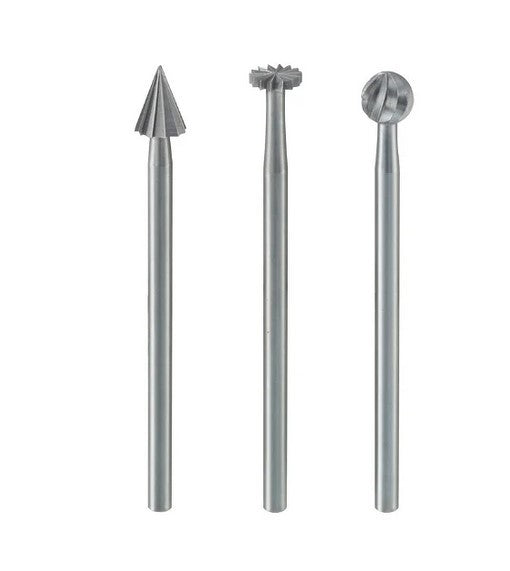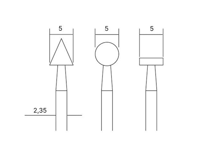Technische Daten: Schaft: Ø 2,35 mm; Fräskörper Kegel: 5,0 mm; Fräskörper Kugel: 5,0 mm; Fräskörper Rad: 5,0 mm
