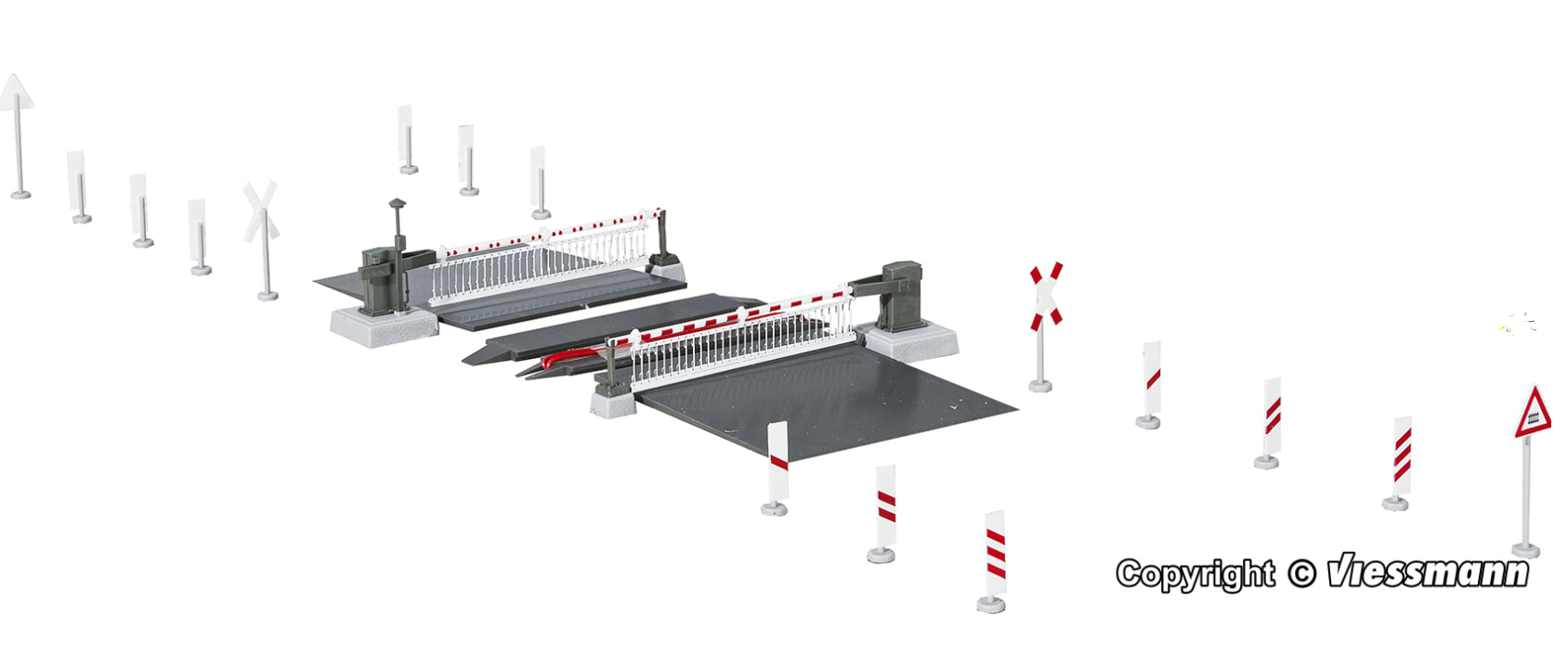 Bahnübergang mit zwei unterflur angetriebenen Bahnschranken, jeweils mit filigranem Behang und Läutewerkattrappe ausgestattet. Die Antriebe ermöglichen vorbildgetreu langsames Öffnen und Schließen der Schranken. Gleisfüllstücke, Auffahrrampen sowie bedruckte Verkehrszeichen liegen bei. Dieser Bahnübergang ist mit dem Satz 5103 erweiterbar, so dass die Straße über beliebig viele Gleise führen kann.