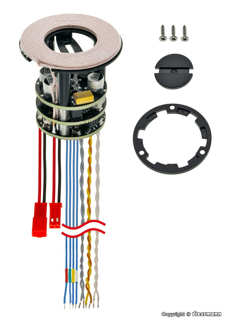 Der InduktivCharger ermöglicht das kabellose Nachladen von Fahrzeugen sowie induktive Kommunikation mit dem Fahrzeug. Fahrzeuge halten auf dem Modul und positionieren sich automatisch über der Ladespule, wobei Ladeströme selbstständig abgestimmt werden. Diese Module eignen sich besonders für Standorte mit längeren Haltezeiten wie Ampeln, Bahnübergänge oder Tankstellen. Mehrere Module können mit kommenden Softwareupdates vernetzt werden, um Fahrzeuge autonom zu Ladepositionen zu steuern. Ein Steuerausgang für den motorischen 2/3-Wege Abzweig Art. 8448, der auch Servos ansteuern kann, rundet die Möglichkeiten ab. Bei den LKW beträgt das Verhältnis von Fahrzeit zu Ladezeit ca. 3 zu 1. Quasi unbegrenzte Fahrzeit ist dadurch möglich. Der InduktivCharger kann auch Fahrzeuge mit Empfängerspulen ein- und ausschalten. Die Fahrzeuge müssen mit der Empfängerspule Art. 8440 nachgerüstet werden.